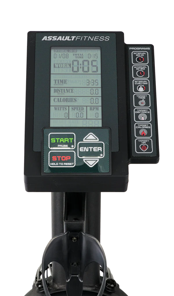 The Assault Fitness console provides clear real-time data on calories, watts, RPM, and heart rate. Bluetooth and ANT+ connectivity allow for pairing with most heart-rate monitors and fitness tracking systems.