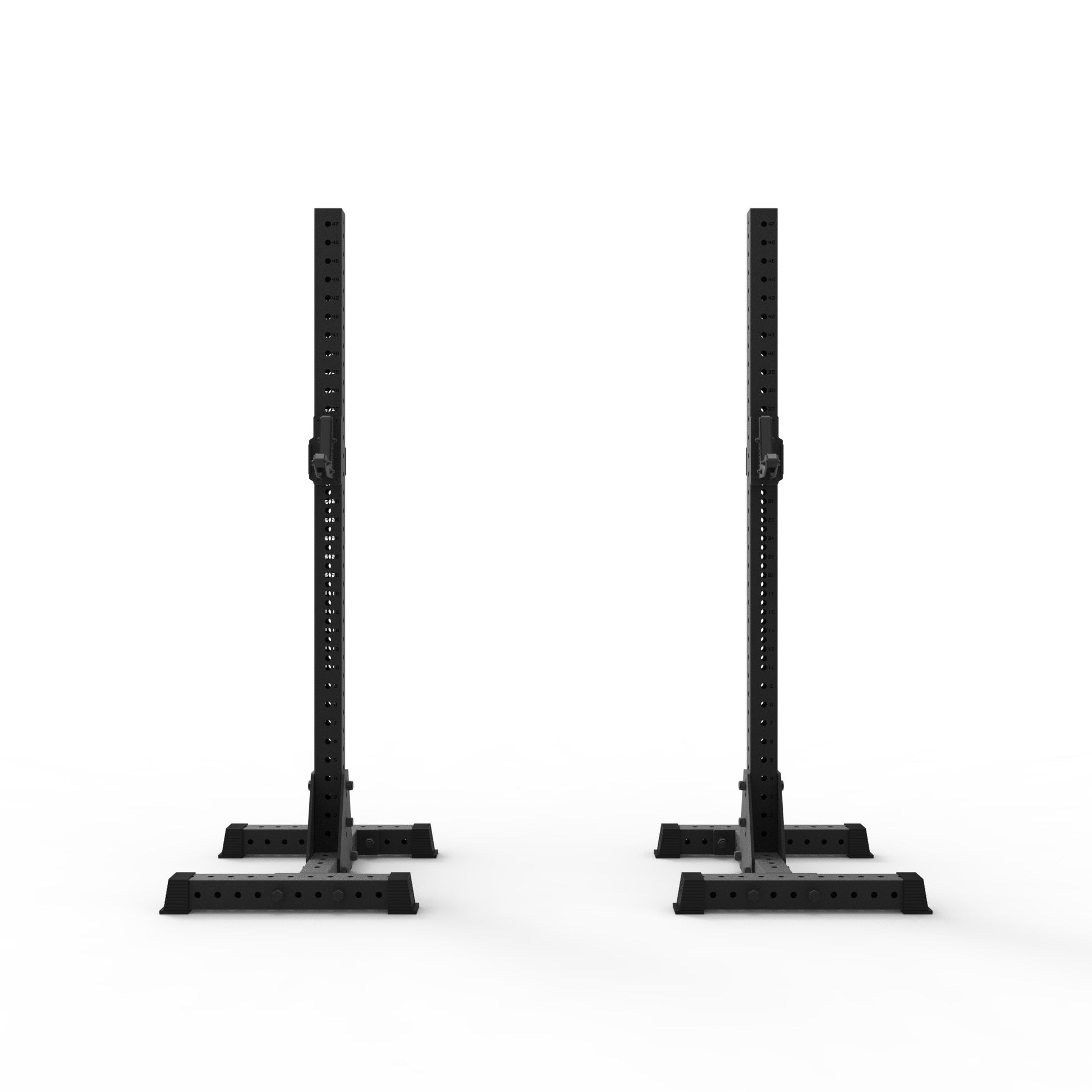 The Zeus Singular Squat Stand redefines independent squat stand performance through an innovative bolt-together assembly utilizing reinforced triangle-plate construction, paired with dual 75 mm heavy-duty steel H-bases for exceptional load-bearing capacity and torsional rigidity. Integrated rubberized feet safeguard flooring while contributing to enhanced base stability, and optional transport wheels enable effortless single-person mobility across training surfaces.Each stand is supplied with a matched pair of 1810 mm (71.3 in) uprights, precision-drilled with Westside-pattern hole spacing (25 mm center-to-center) throughout the bench press zone for granular adjustability of the included J-cups to suit diverse athlete ergonomics. The compact H-base footprint measures 750 mm x 620 mm (29.5 in x 24.4 in) per side, optimizing platform space utilization while facilitating rapid reconfiguration.